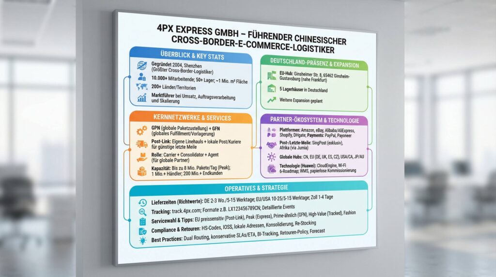 4PX hat sich vom chinesischen Logistik-Spezialisten zum globalen E-Commerce-Enabler entwickelt: starke Netze (GPN, GFN), ein breites Serviceportfolio mit rund 20 Versandoptionen, über 50 Lager weltweit, strategische Präsenz in Deutschland und belastbare Technologie durch die Huawei-Kooperation. Als Consolidator und Carrier mit Partnern wie DHL, FedEx, UPS, Aramex sowie SingPost und Jumia verbindet 4PX günstige Cross-Border-Routen mit verlässlicher letzter Meile.