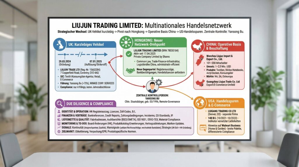 Das Unternehmensnetzwerk um den Namen Liujun ist modular und grenzüberschreitend aufgebaut. Die britische LIUJUN TRADE LTD war ein kurzes Vehikel mit klarer Governance-Struktur (Direktor und PSC: Yansong Bu) und breiter Handelspositionierung über Agenturgeschäft, Retail und E-Commerce. Die freiwillige Auflösung in UK, gefolgt von der Gründung der liujun trading limited in Hongkong, spricht für eine strategische Verlagerung dorthin, wo Beschaffung, Logistik und Finanzabwicklung für diese Art von Warenströmen am effizientesten sind. Operative Ankerpunkte in China (Wenzhou, Guangzhou) und Spuren in US-Importdaten zeichnen das Bild eines aktiven, aber dynamisch restrukturierten Handelsclusters. Für dich als Partner oder Kunde ergibt sich ein klares Handlungsfeld: sorgfältige KYC/AML-Prüfung, Lieferketten-Transparenz, klare Vertrags- und Qualitätsstandards – und laufendes Monitoring der HK-Einheit als nunmehrigem Kernvehikel.